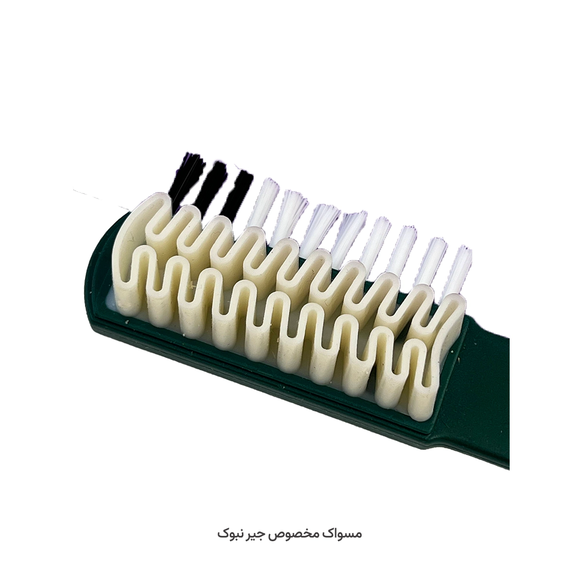 3. لکه‌های عمیق: اگه با لکه‌های سرسخت مواجه شدید، می‌تونید از پاک‌کن مخصوص جیر و نبوک استفاده کنید و بعد با این مسواک دوباره سطح رو تمیز کنید.